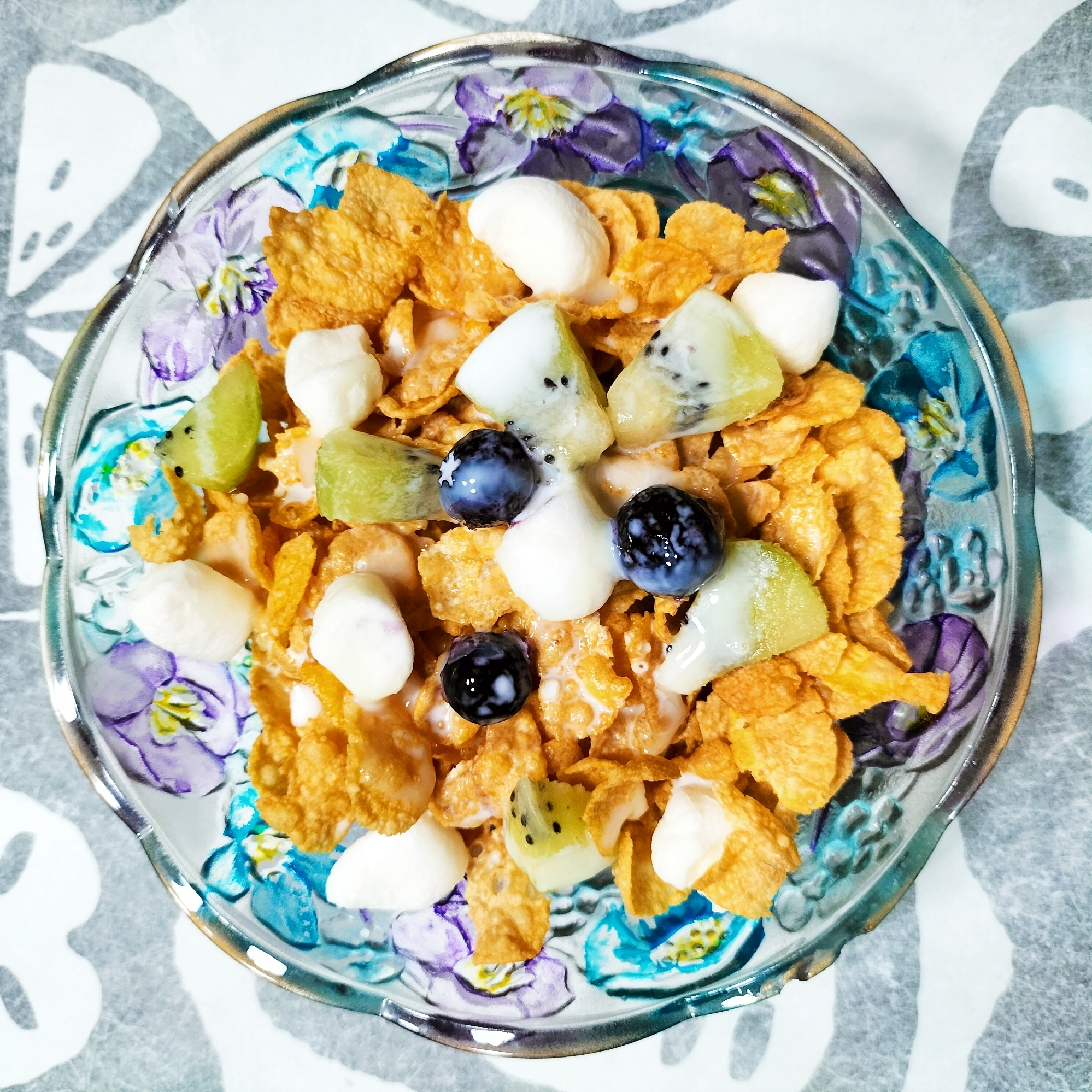 レシピタイトル:キウイフルーツとブルーベリー入りコーンフレーク