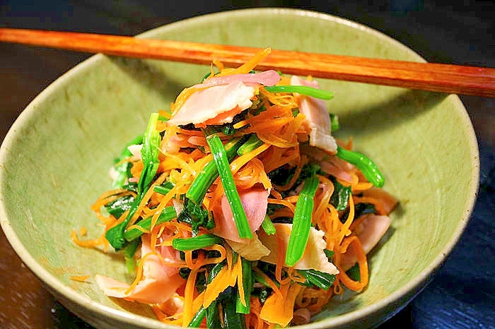 レシピタイトル:青菜と酢玉ねぎとベーコンの和えもの