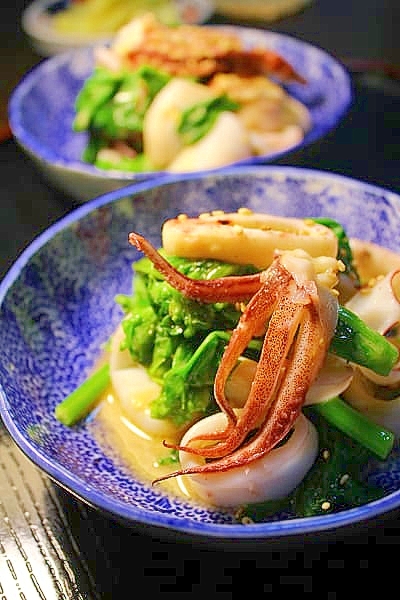 レシピタイトル:ヤリイカと菜花のオイル蒸し