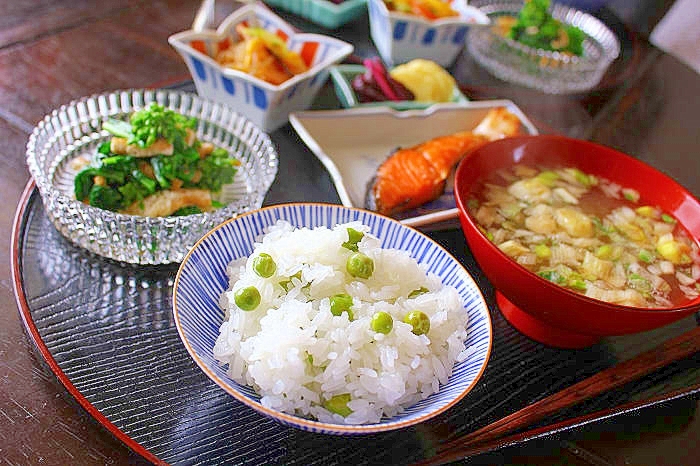 レシピを考えた人のコメント:冷凍のグリンピースを使うので、昆布出汁で風味をつけます