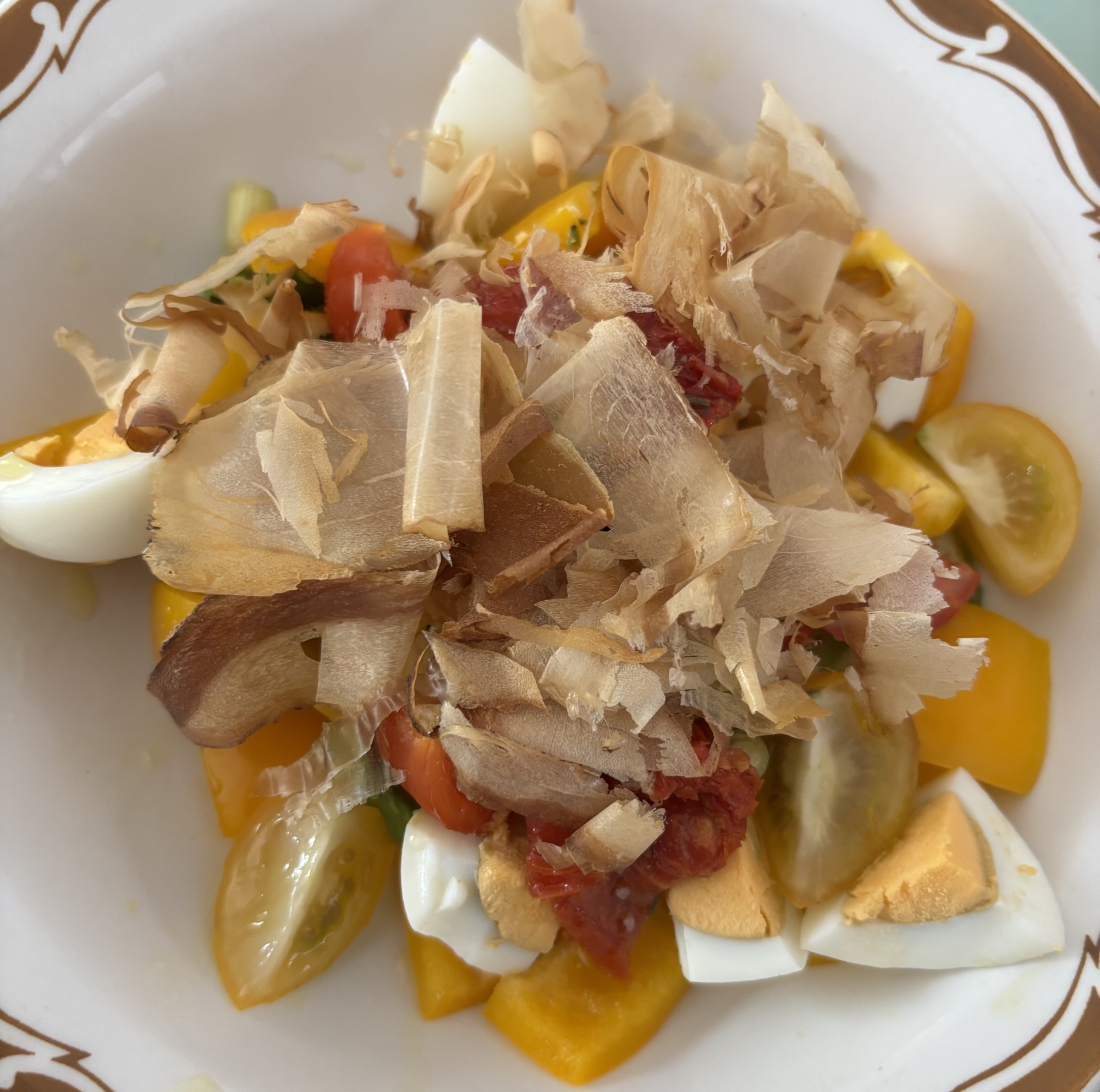 レシピタイトル:たんぱく質たっぷりサラダ鰹節添え