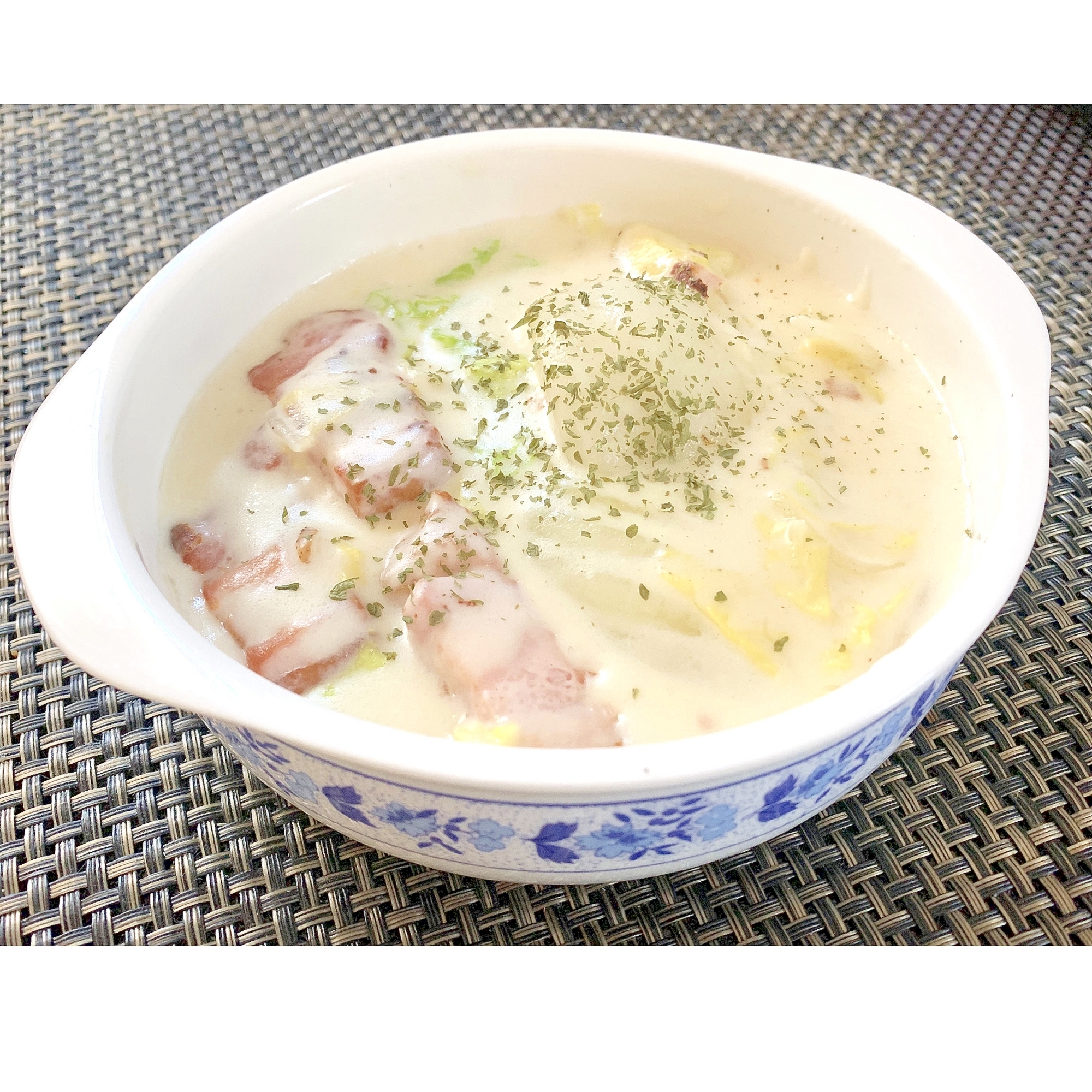 レシピタイトル:厚切りベーコンと白菜のクリーム煮