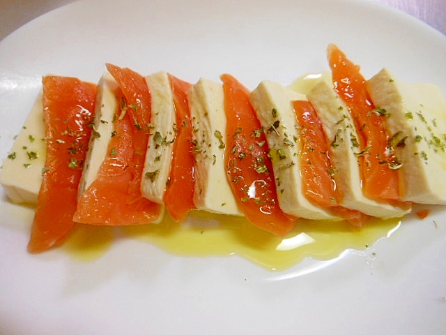 おつまみに★塩豆腐とスモークサーモンのカプレーゼ風
