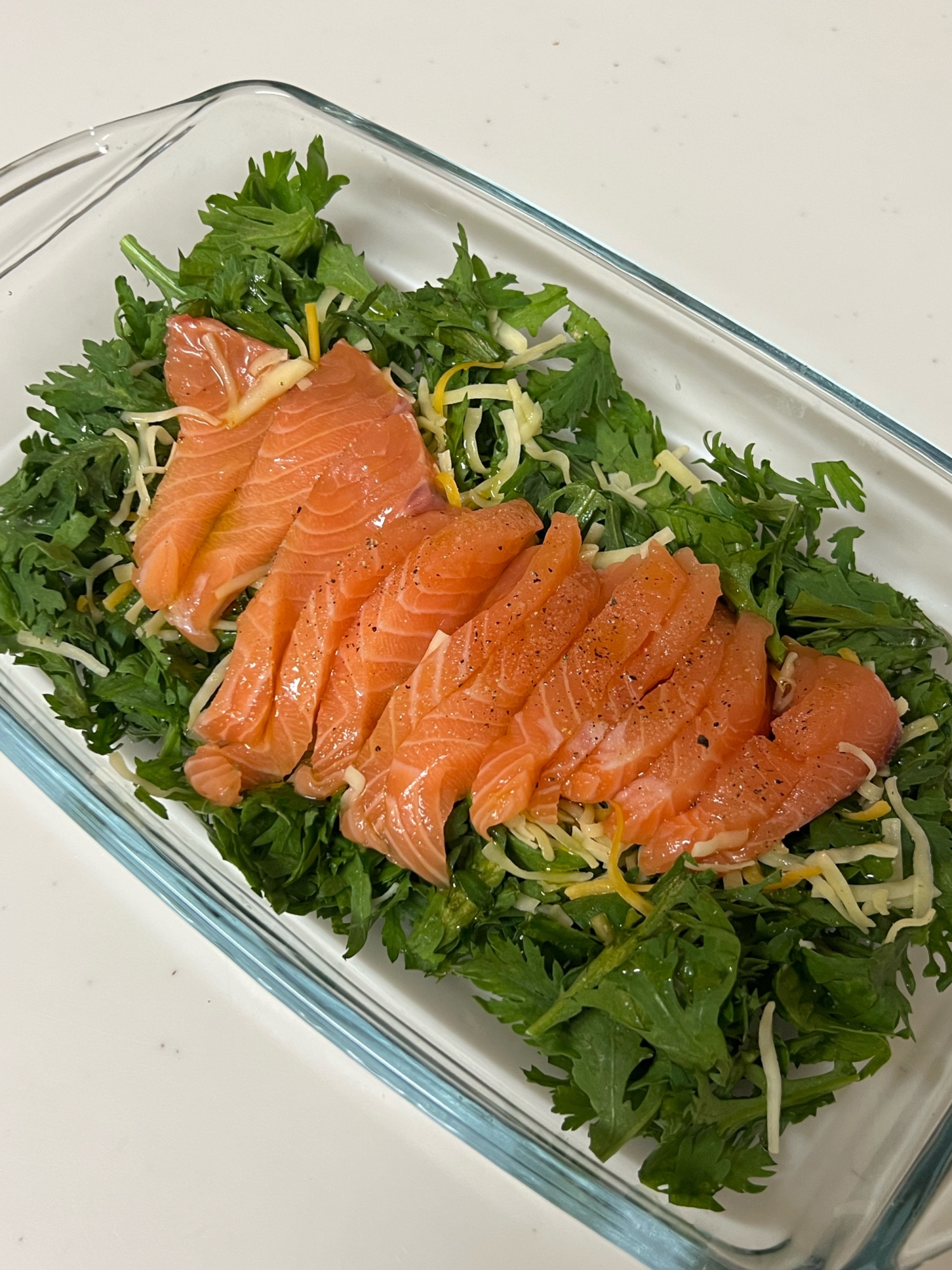 レシピタイトル:サーモンと春菊のマリネサラダ