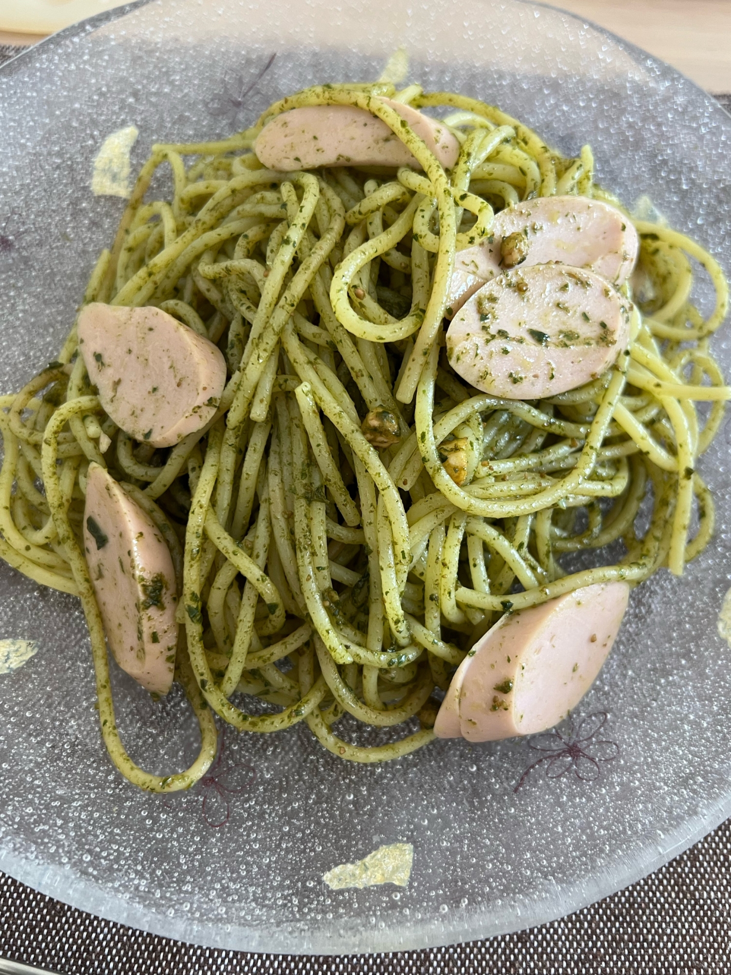 魚肉ソーセージ入りのジェノベーゼパスタ