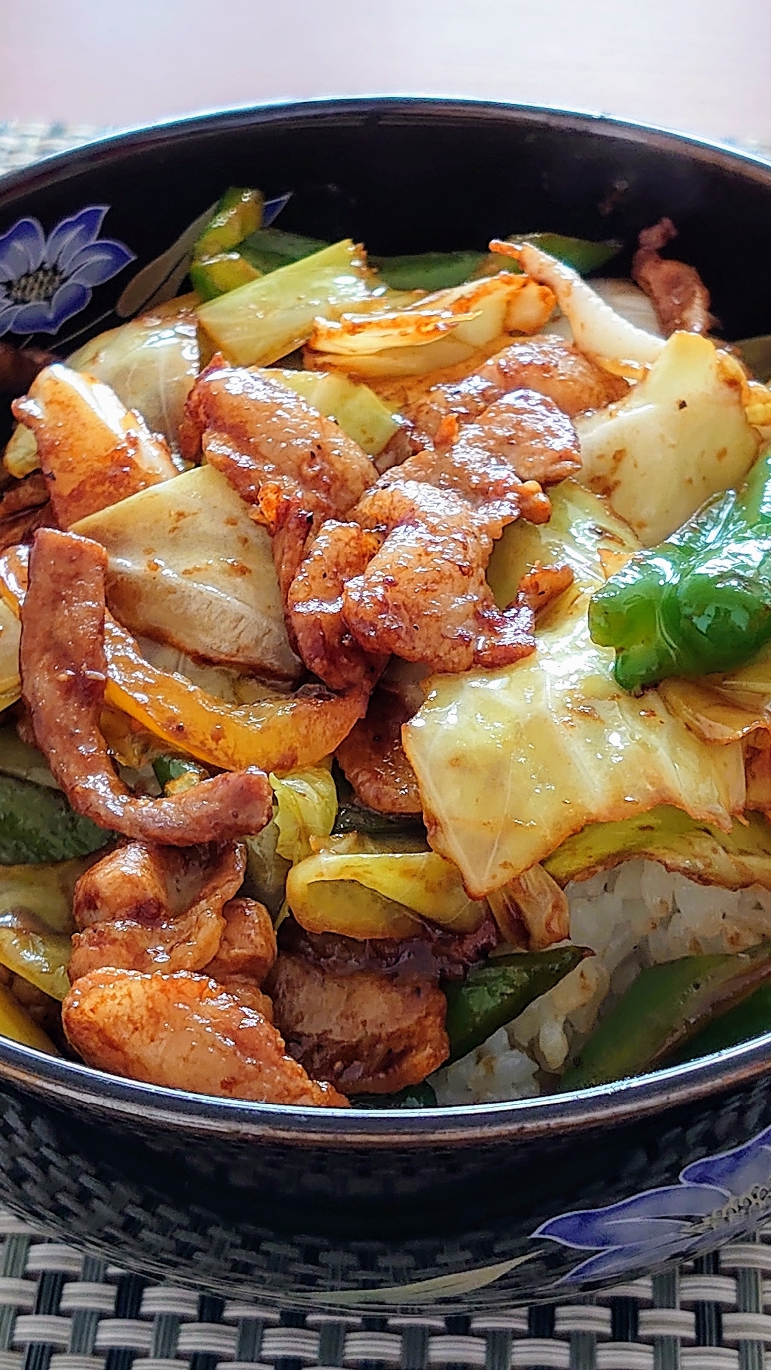 :肉、キャベツ他を炒めて甜麺醤で味付けするだけの簡単丼です