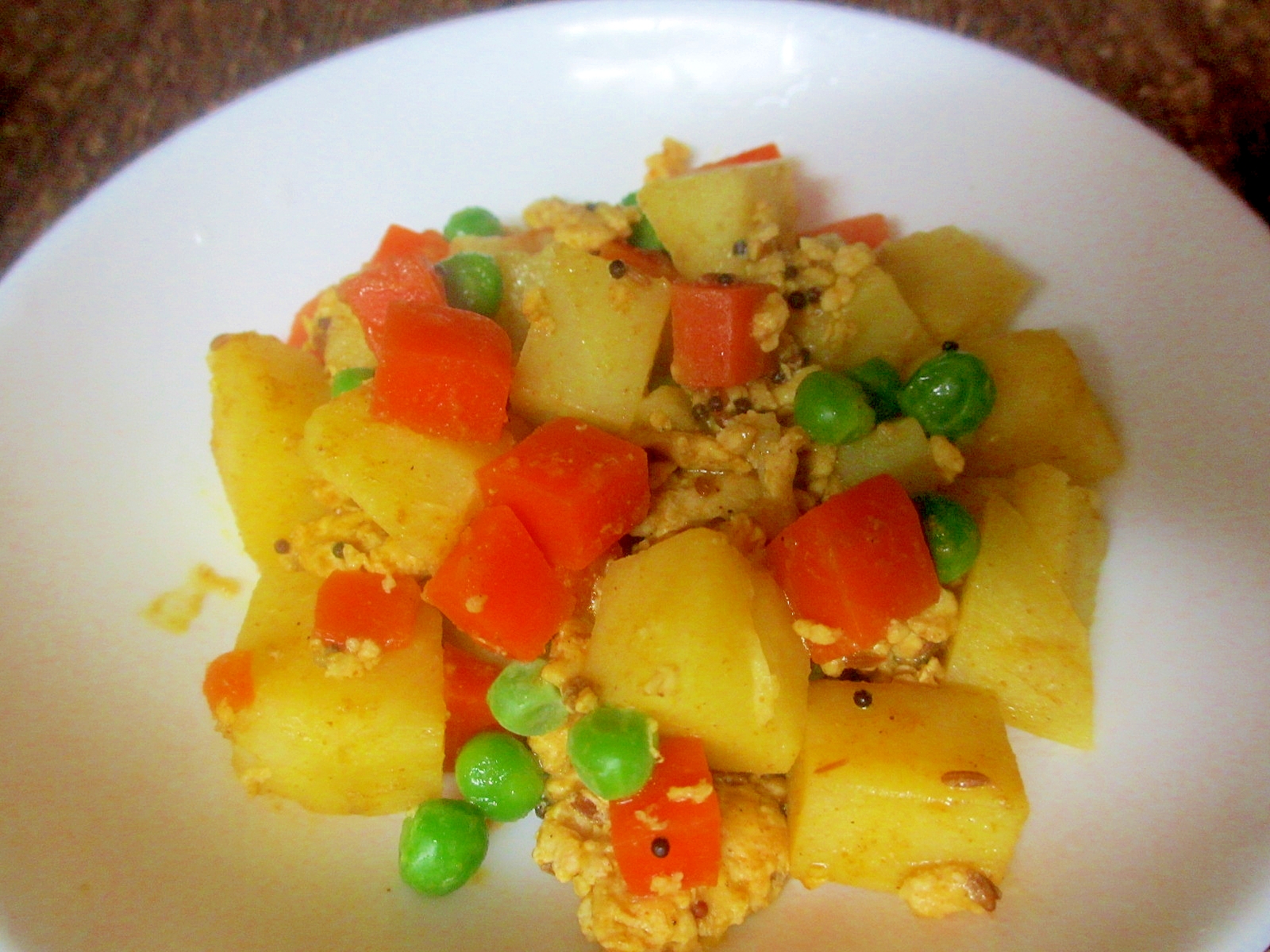 レシピタイトル:グリンピースとジャガイモ、ひき肉のスパイス炒め煮