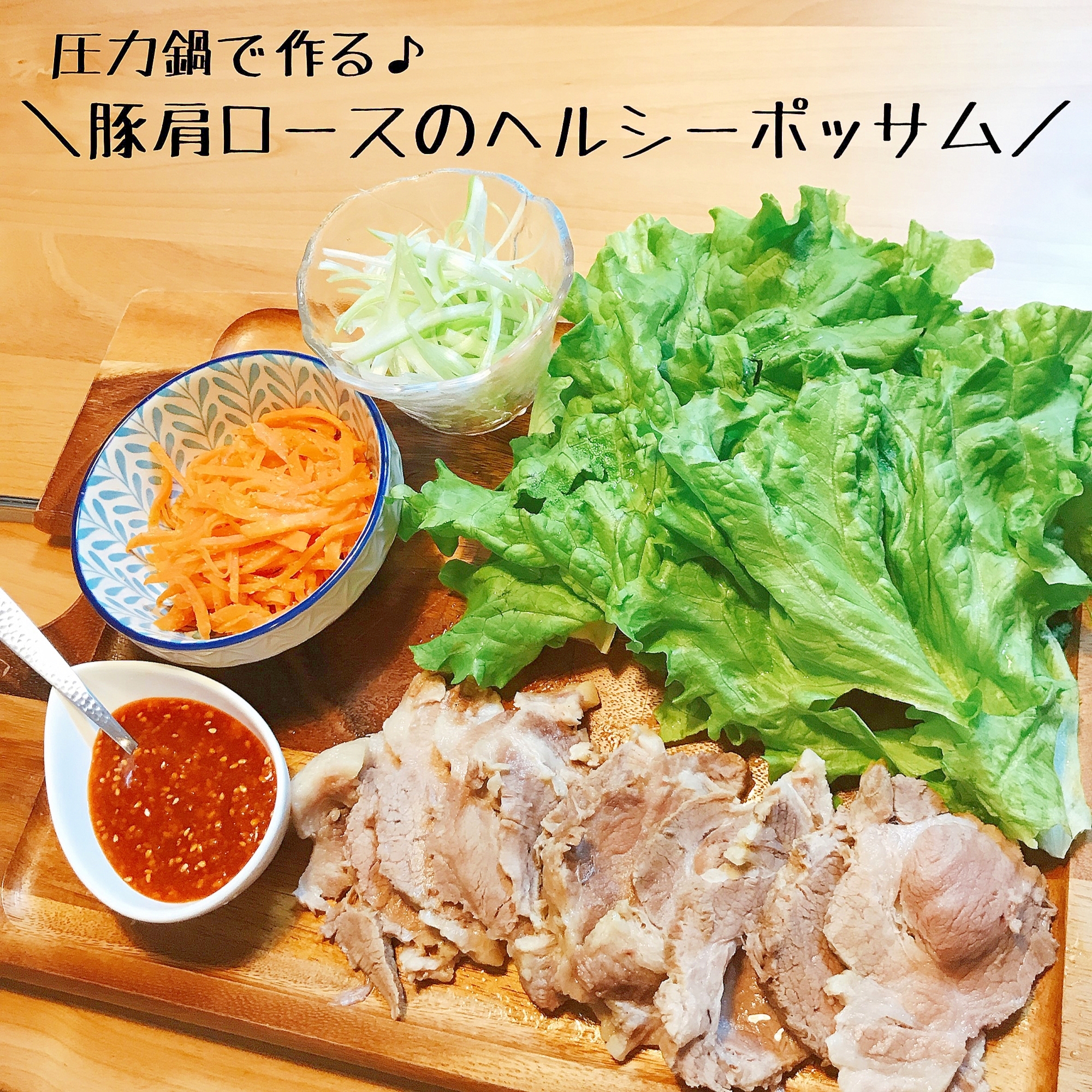 :お肉は食べたいけど、ヘルシーがいいという欲張りな人向け! 豚バラよりもヘルシーな豚肩ロースで作るポッサムです。圧力鍋で煮るからとっても柔らか♪