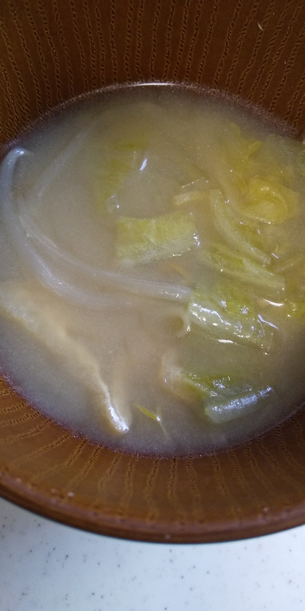 レシピタイトル:白菜ともやしと油揚げのお味噌汁