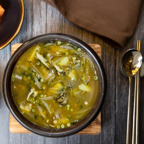 :希釈用だしつゆでじゃがいもと黒舞茸の生青のり味噌汁