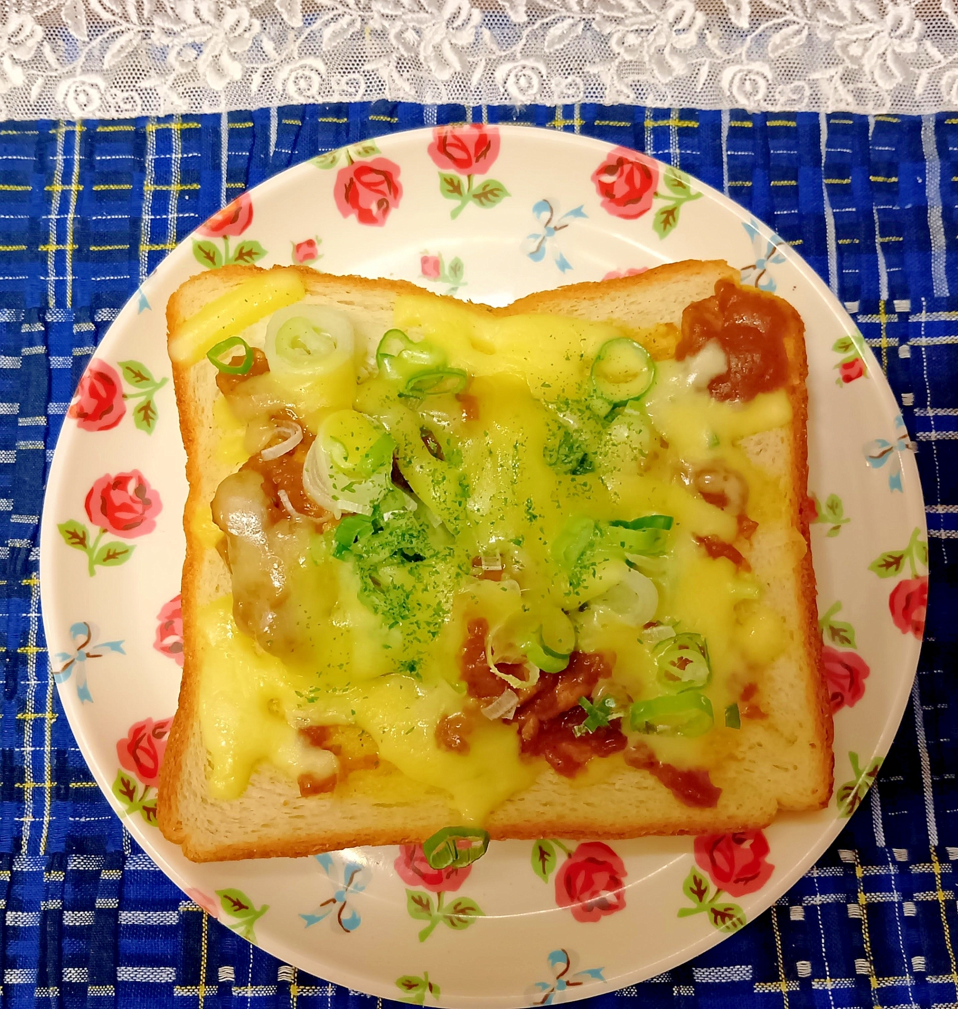 レシピを考えた人のコメント:冷蔵庫にあるものでカレーピザトースト
