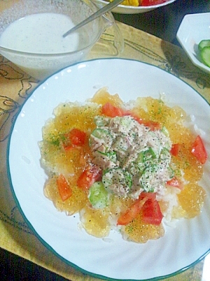 :市販の冷たいスープの素を使って夏らしいジュレメシはいかがでしょうか。きれいなのでおもてなしにもお勧めです。