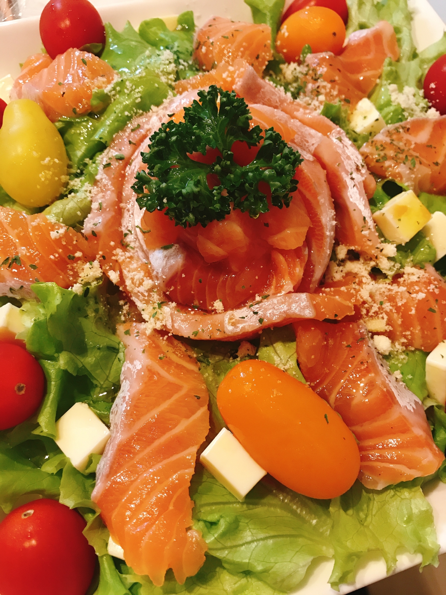 レシピを考えた人のコメント:サーモンの切り身を花びらのように飾り付けたカルパッチョ♪
