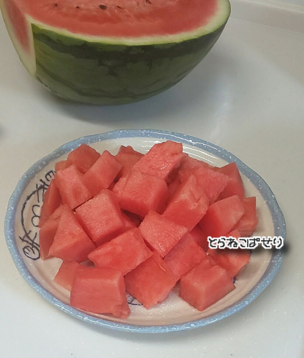 レシピを考えた人のコメント:スイカを食べやすいように、いつもこの切り方で切り、冷蔵庫で冷やしていただきます。