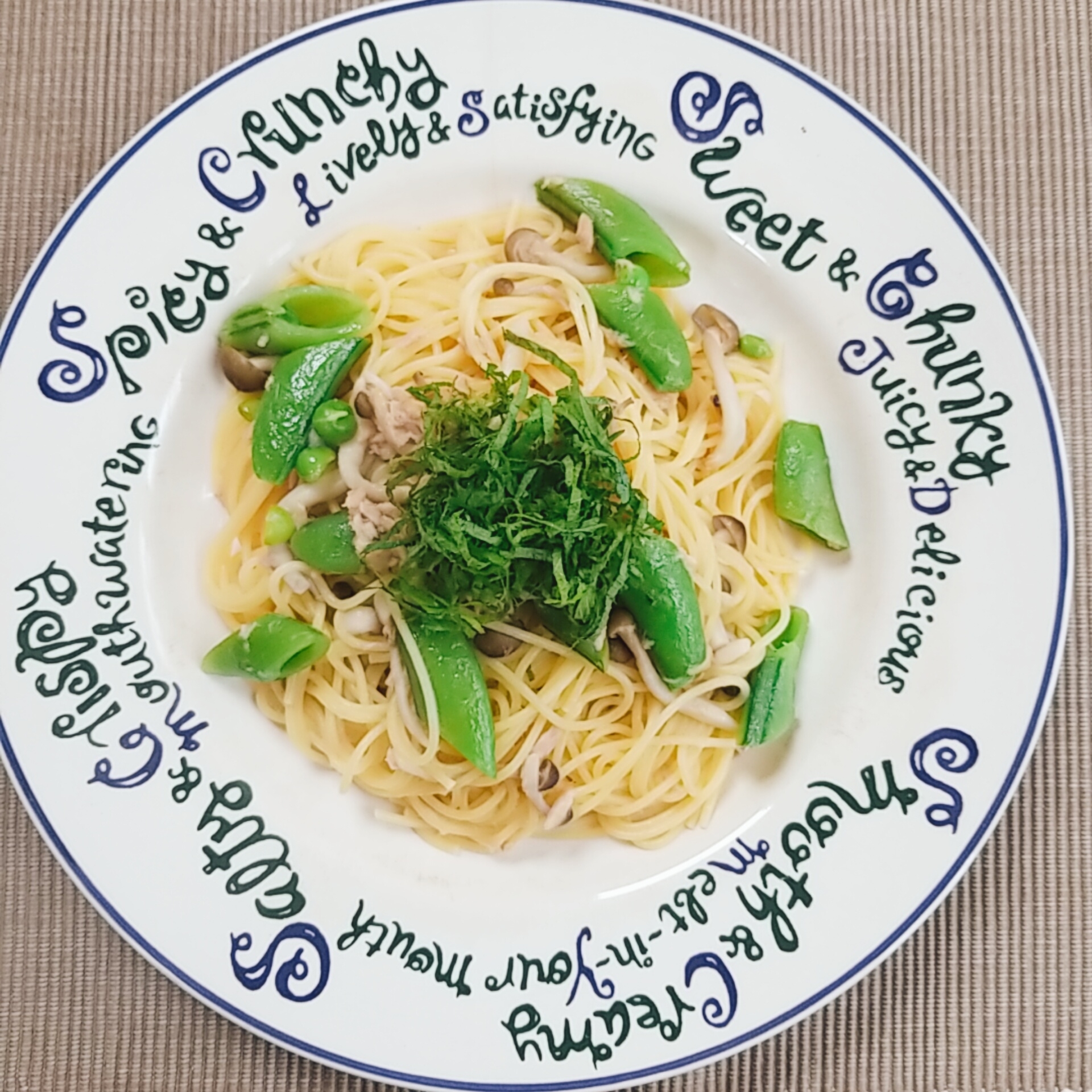 レシピタイトル:白だしで☆ツナとスナップえんどうのパスタ