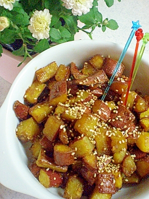 レシピタイトル:小さなさつまいも集合~♪焼くサイコロ大学いも