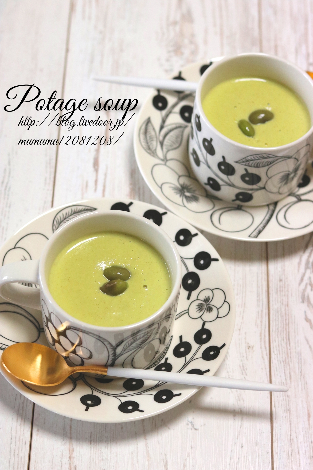:枝豆の炊き込みご飯で出たさやを使ってポタージュにしました。 バイタミックスを使うので、お持ちの方は是非ともお勧めです。