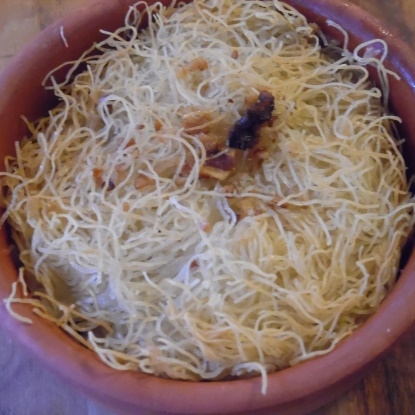:クルミ入りのTel Kadayıf Tatlısı(テル・カダイフ・タットゥルス)です。シロップ少なめにしています(じゃないと、ものすごく甘いので)