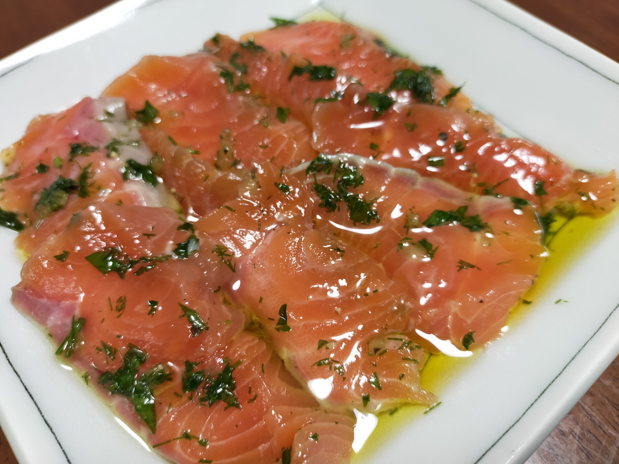 レシピタイトル:ハーブで漬けたサーモンカルパッチョ