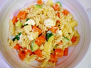 レシピを考えた人のコメント:マカロニと野菜をクリームチーズとドレッシングで和えたサラダです。意外としつこくなくさっぱり美味しいです。