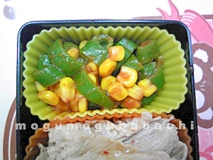 レシピタイトル:レンジで作る☆ピーマンとコーンのケチャップ炒め