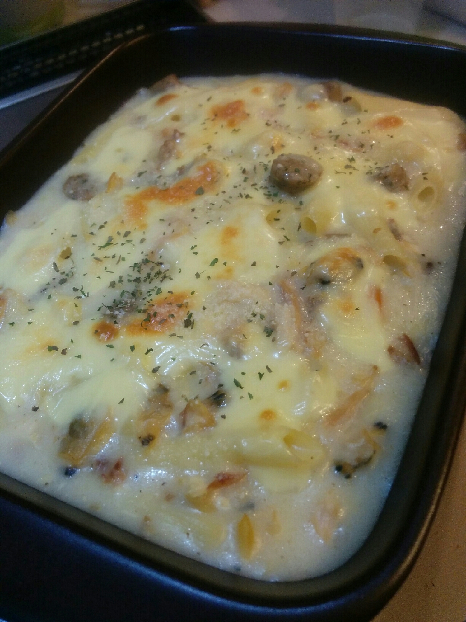 :ロティサリーチキンの骨から作った鶏ガラスープ(レシピID:1190015287)とチキンの身を入れたグラタンです。
