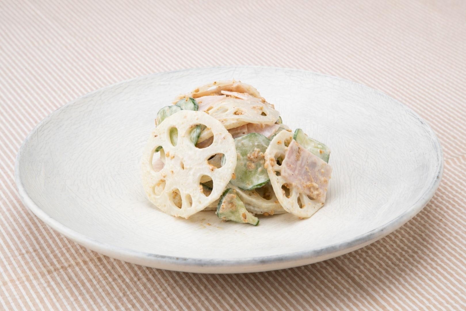レシピを考えた人のコメント:定番のれんこんサラダです!れんこんを甘酢で煮てしっかり下味をつけるので、一味ちがうれんこんサラダになります!