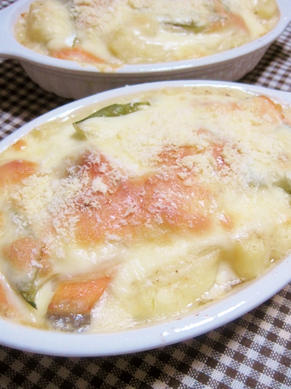 :じゃがいも、鮭、ミルク・・・これぞ北海道の幸!(というか石狩鍋?笑) ニョッキを手作りしてグラタンにします。 もちっむにゅっとした食感がよく合います♪