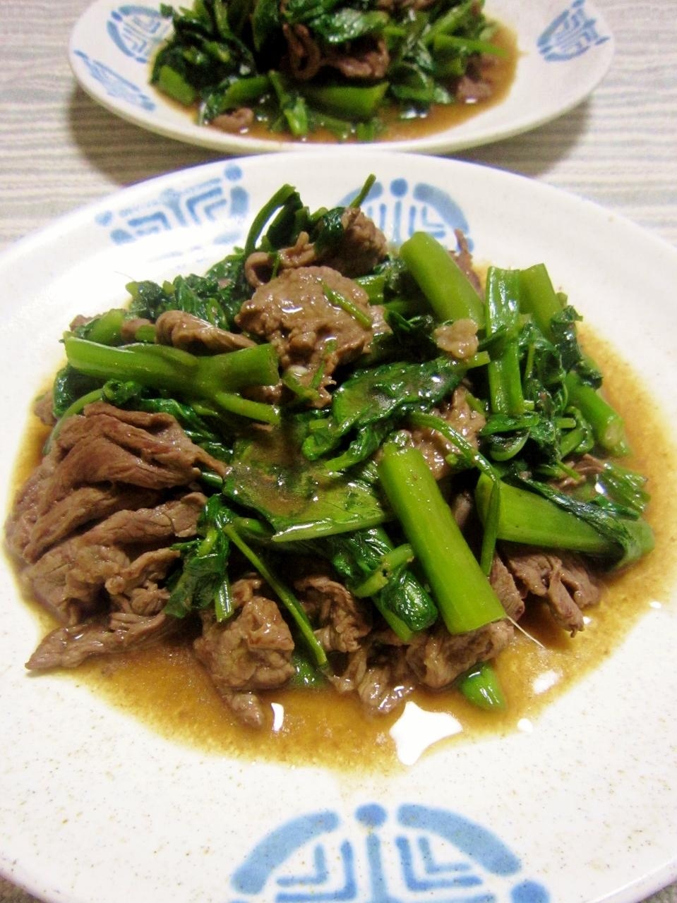 :オイスターソースをからめた牛肉にしゃきしゃき空芯菜♪ 旨みもコクもばっちり、ご飯やお酒が進みますよ。