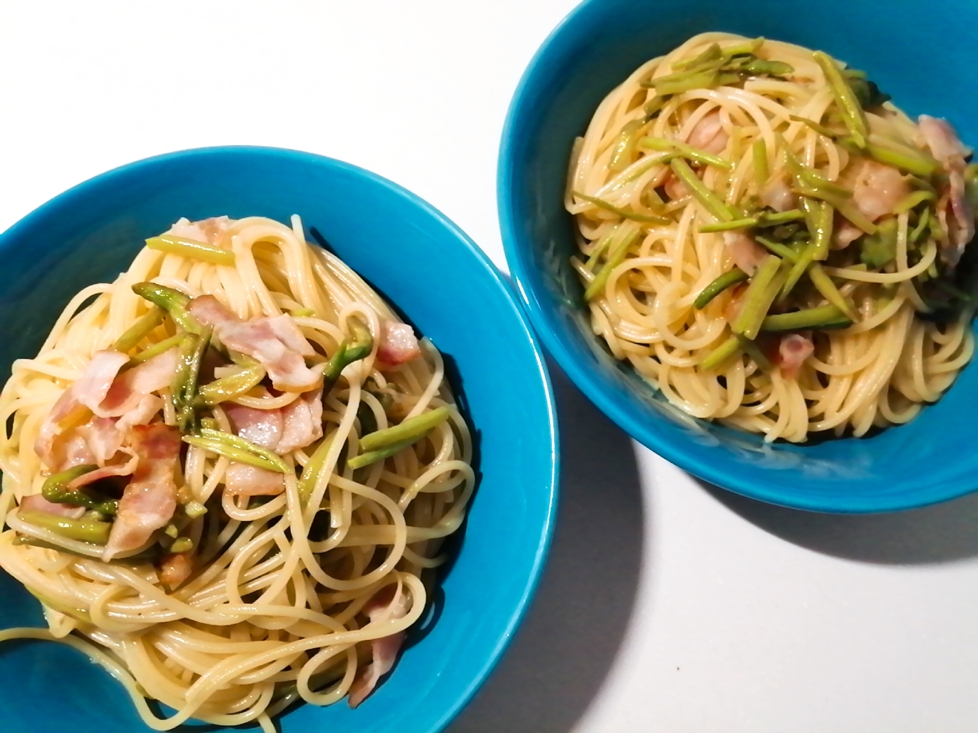 レシピを考えた人のコメント:春の山菜、フキとタラの芽をパスタにしました。
