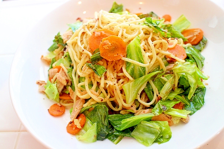 :生姜が効いたピリッとスッキリした味わいの塩焼きそば。 ノンオイルのツナ缶で、サッパリヘルシーで簡単な中華風海鮮焼きそば。野菜もたっぷり摂れる一皿です。