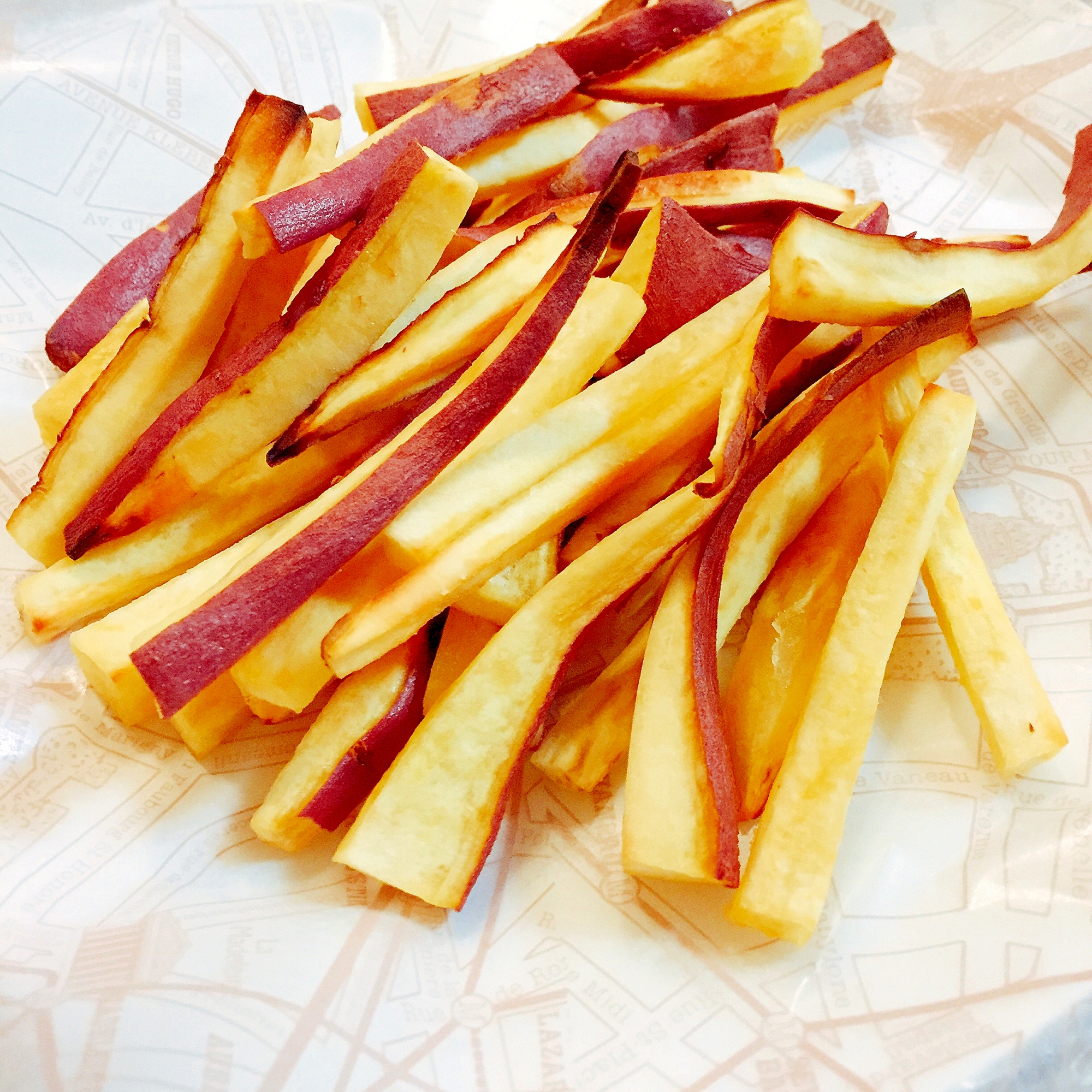 :揚げないのでヘルシー、ホクホク甘く端っこはカリカリのさつまいもフライです♪ オーブンまかせなので、ガスコンロで作るメインと同時にアツアツのうちに食卓に出せます♡