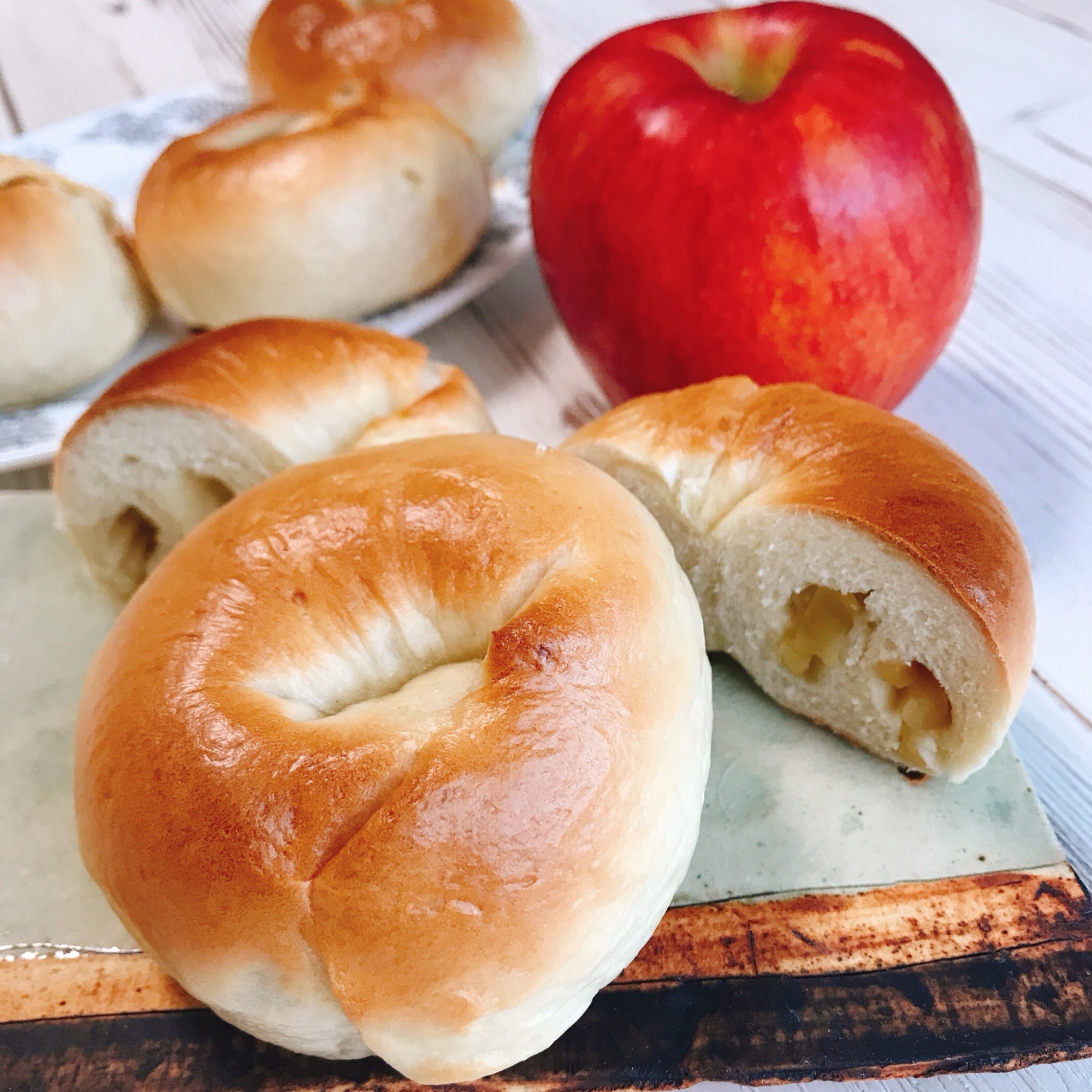 :ジューシーなりんごが入ったベーグル。 オーブンの発酵機能を使うレシピです。 お湯の温度も重要なので温度計のご用意を!タイマーもあれば便利です!