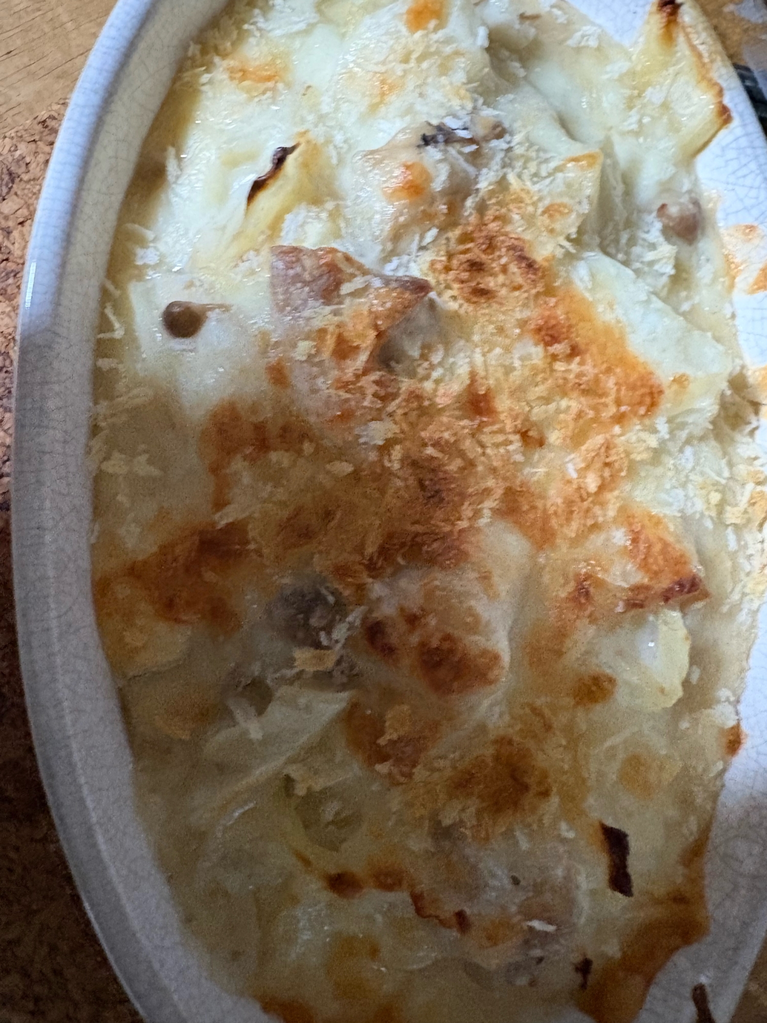 レシピタイトル:鶏肉とキャベツのグラタン風