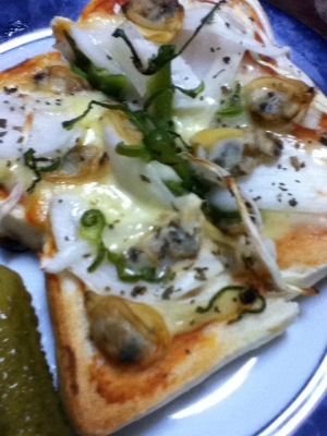 レシピタイトル:アサリと新玉ねぎとピーマンのピザトースト