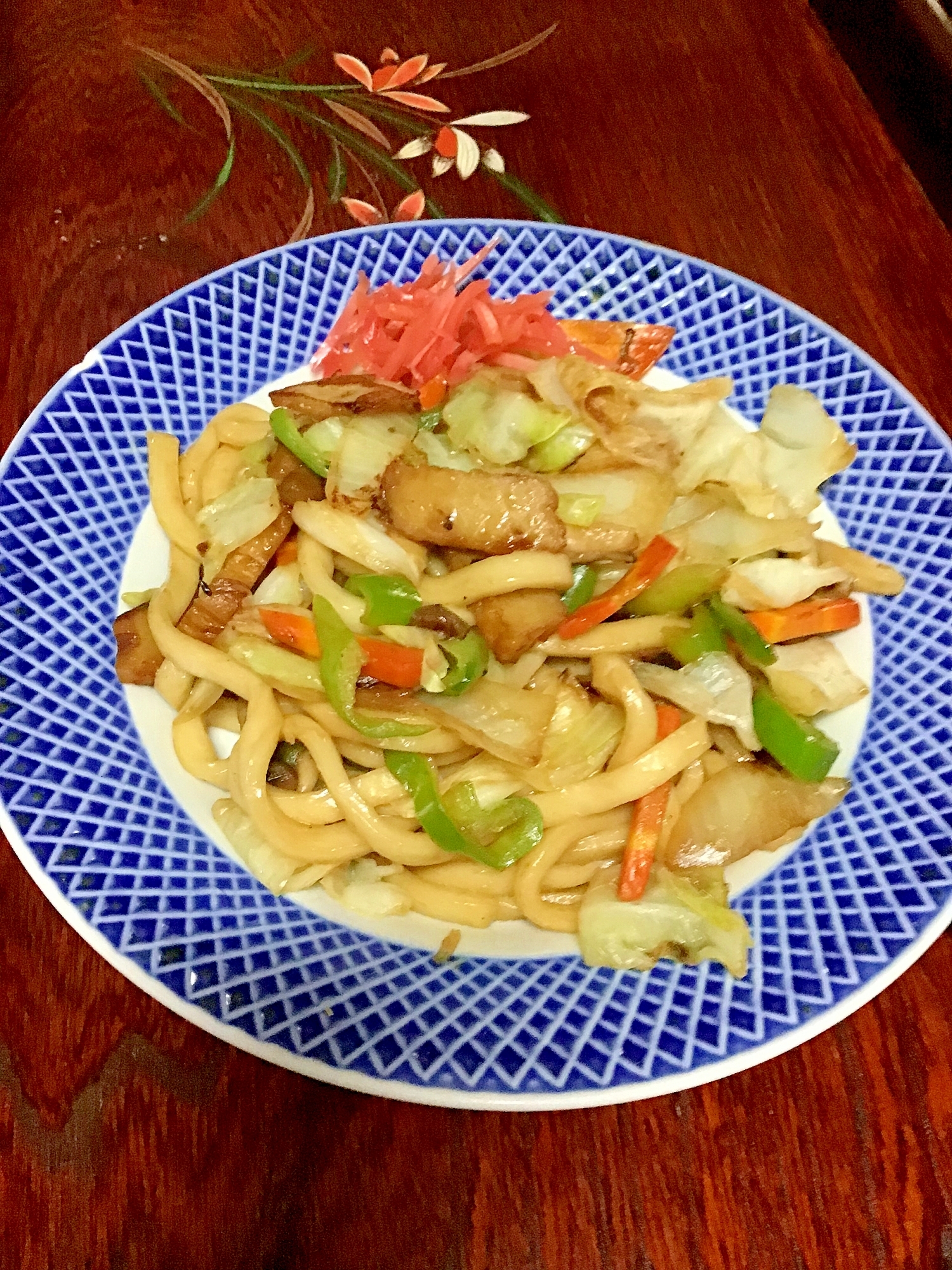 レシピタイトル:さつま揚げの焼きうどん@焼き肉のタレ味。