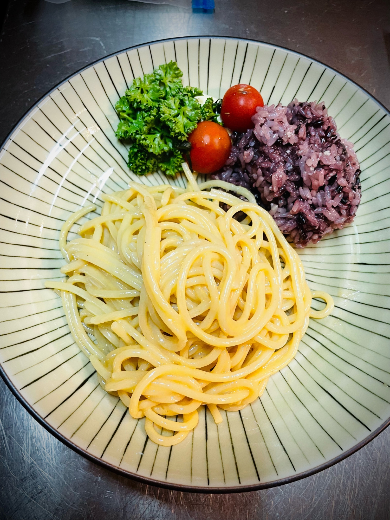 :無印良品のうにクリームを使って、なんと2.2ミリの太パスタで焼そばみたいなガーリックパスタにしました♪ うにとにんにくがたまらん。 パスタ1束のメニューです。
