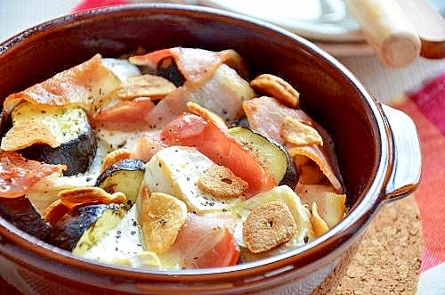 :夏野菜でビールやワインにピッタリのおつまみ! フライドガーリックとベーコン・カマンベールチーズの旨味たっぷり、味付けは黒胡椒のみで十分です(^^)