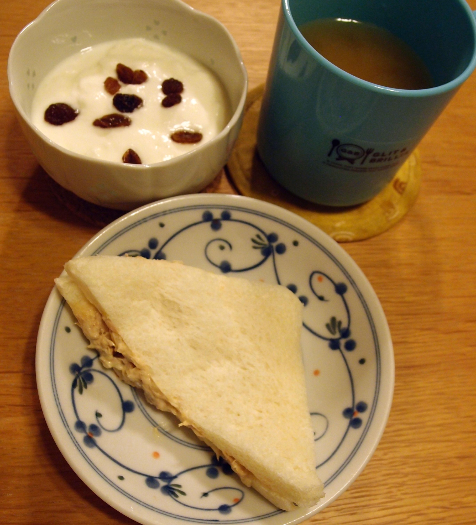 ツナマヨサンドとヨーグルトとミルクティーの朝食