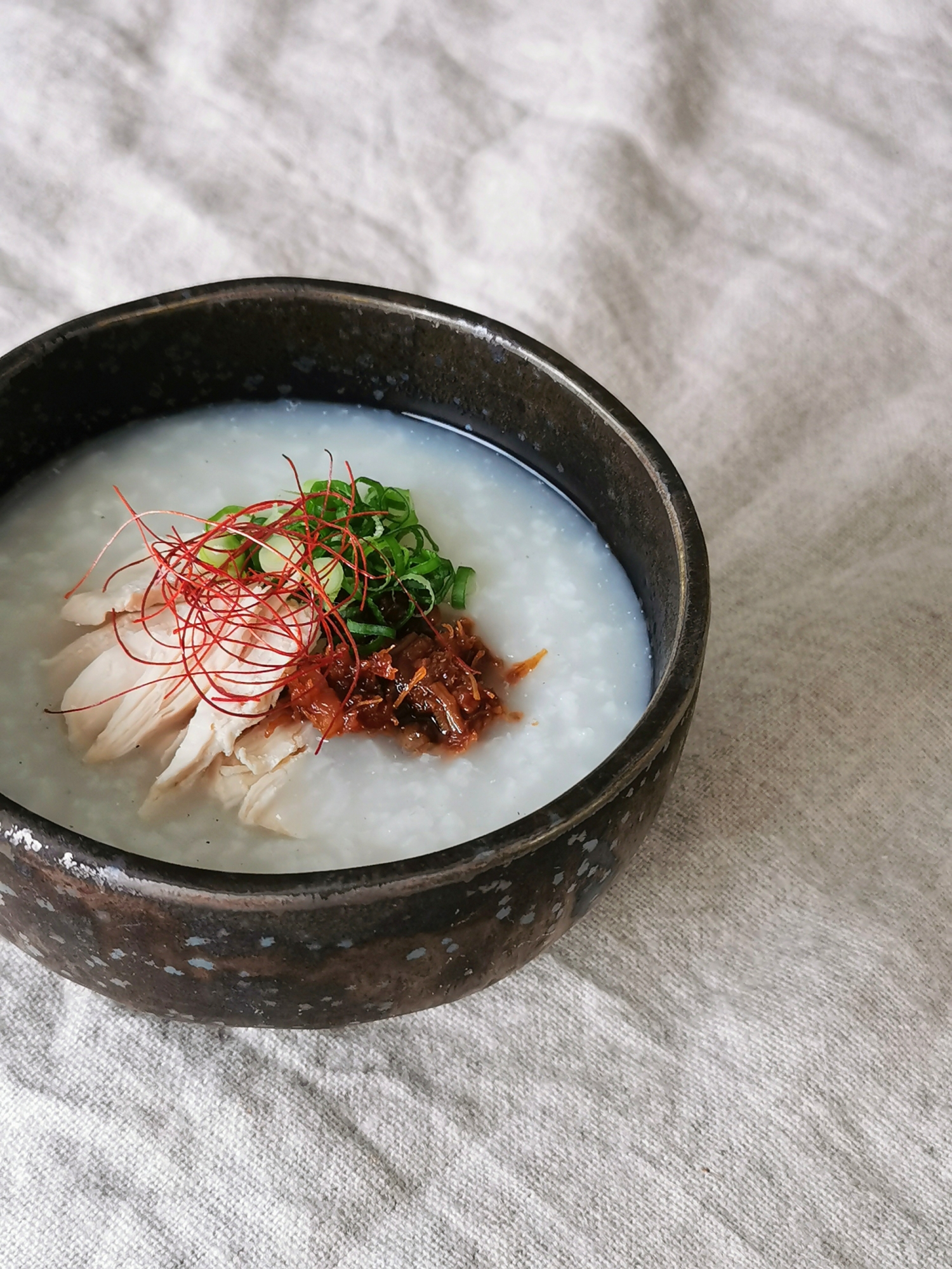 :さっぱりとした鶏肉と貝柱の旨みたっぷりの中華粥です。 急がずゆっくりお米から炊いてスープをしっかり吸ったお粥はいつものお粥とはちょっと違います♪