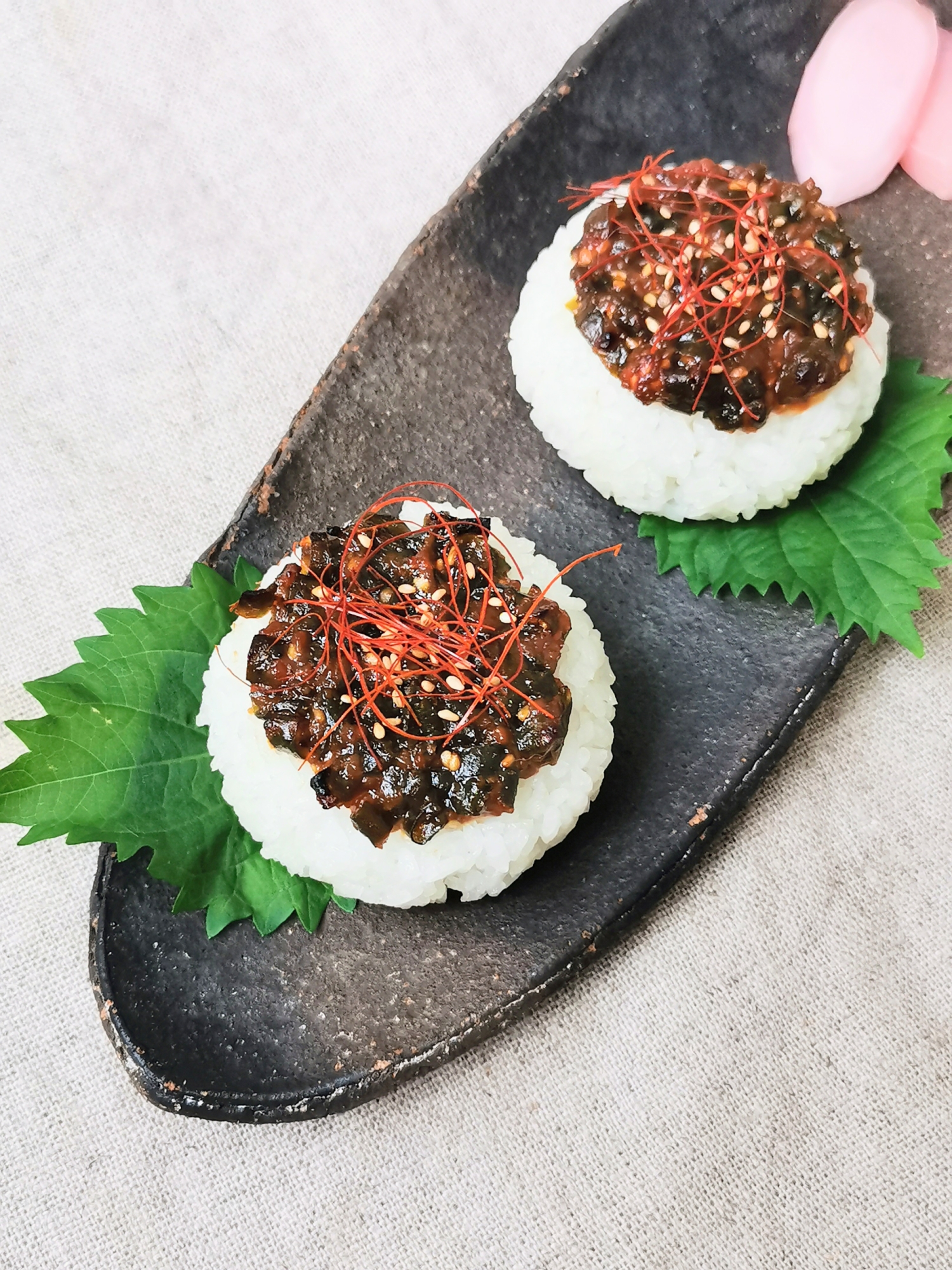 :青唐辛子味噌を作ったら作りたい1品。 焼けた味噌の香ばしさとぴりっとした味がたまらないおにぎりです。