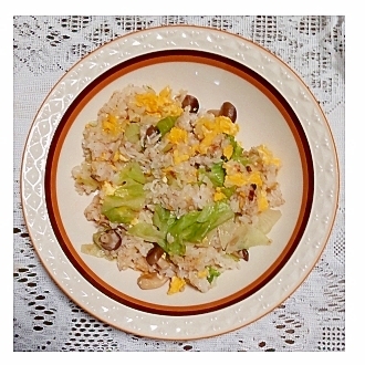 レシピを考えた人のコメント:レタス、しめじ、たまごを入れたチャーハンです。