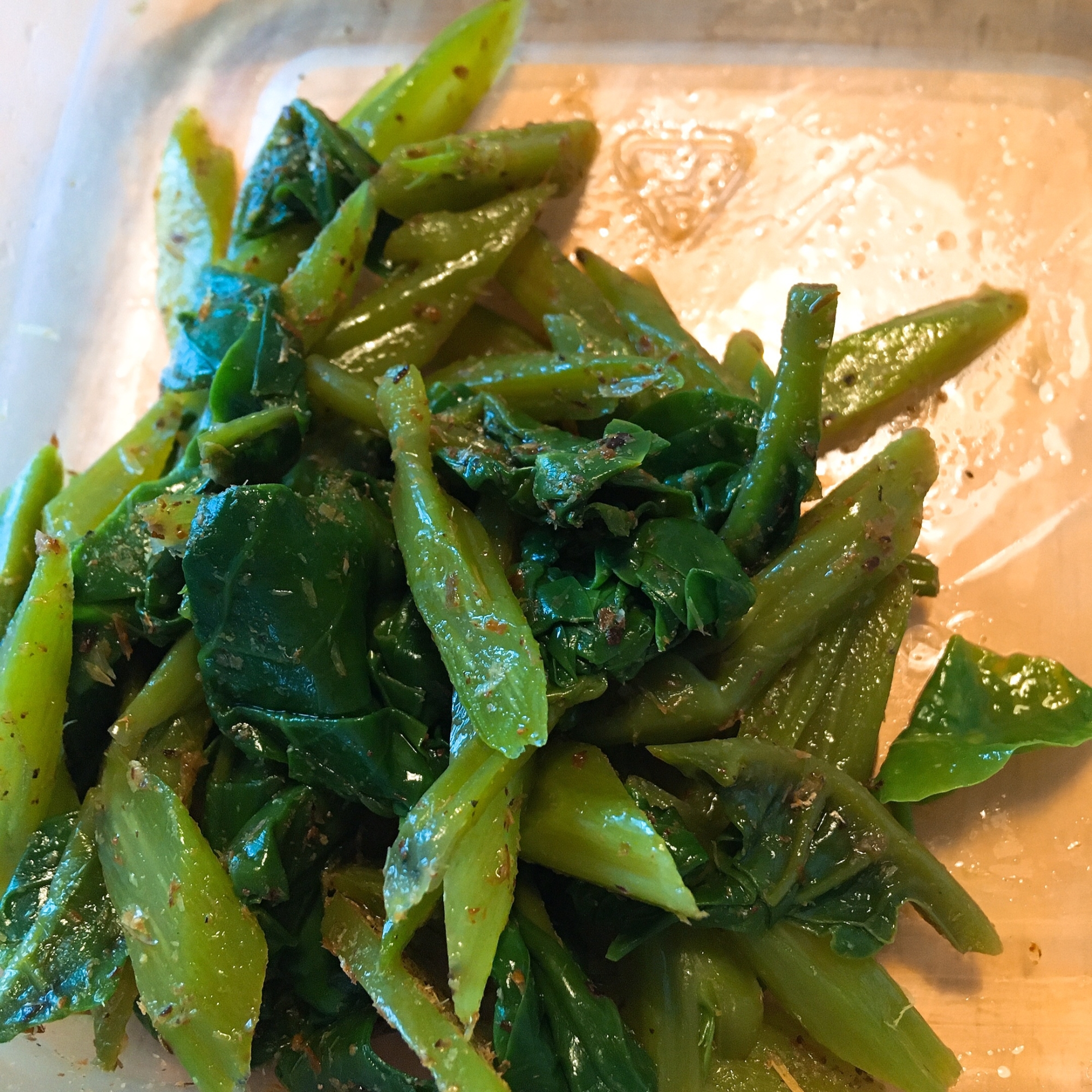 レシピタイトル:つるむらさき×削り粉 おひたし