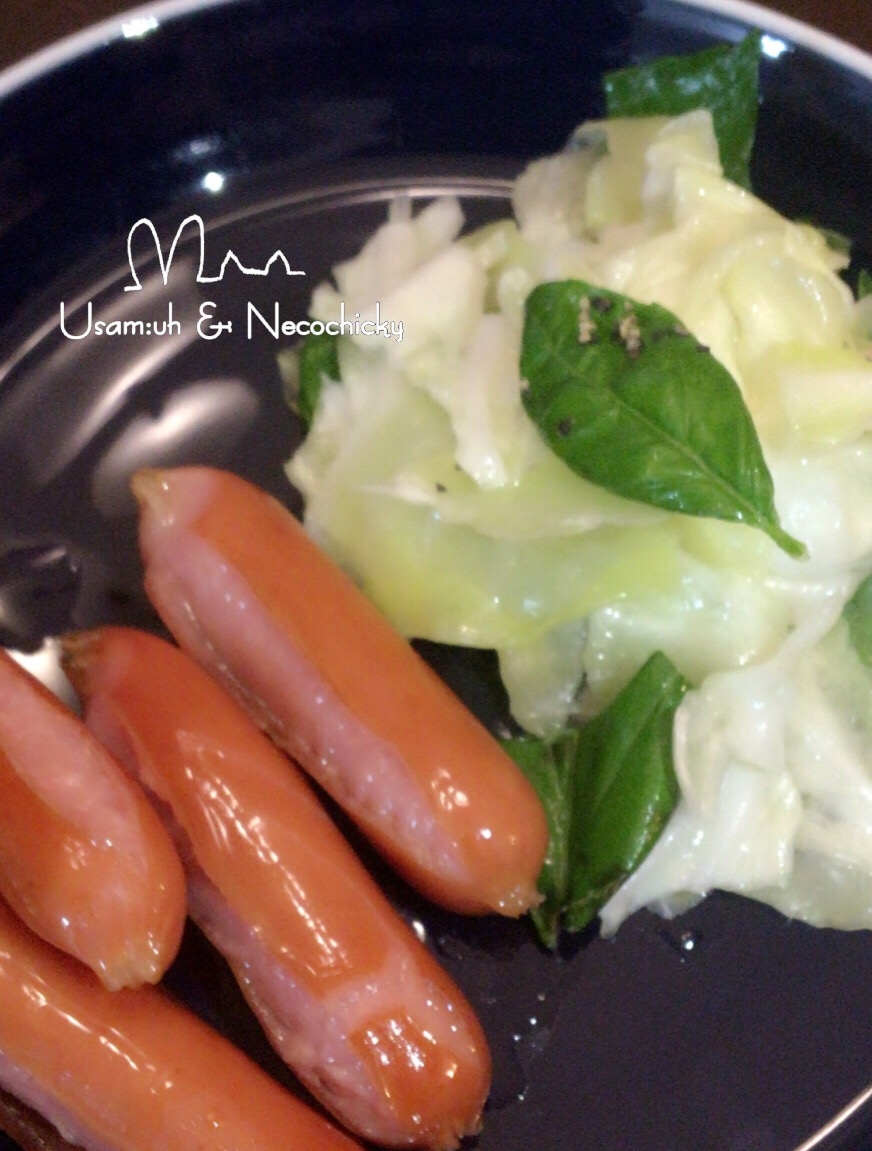 :炒めたソーセージの添え野菜に即席で出来る口当たり爽やかなザワークラウト風キャベツ&バジルを作りました