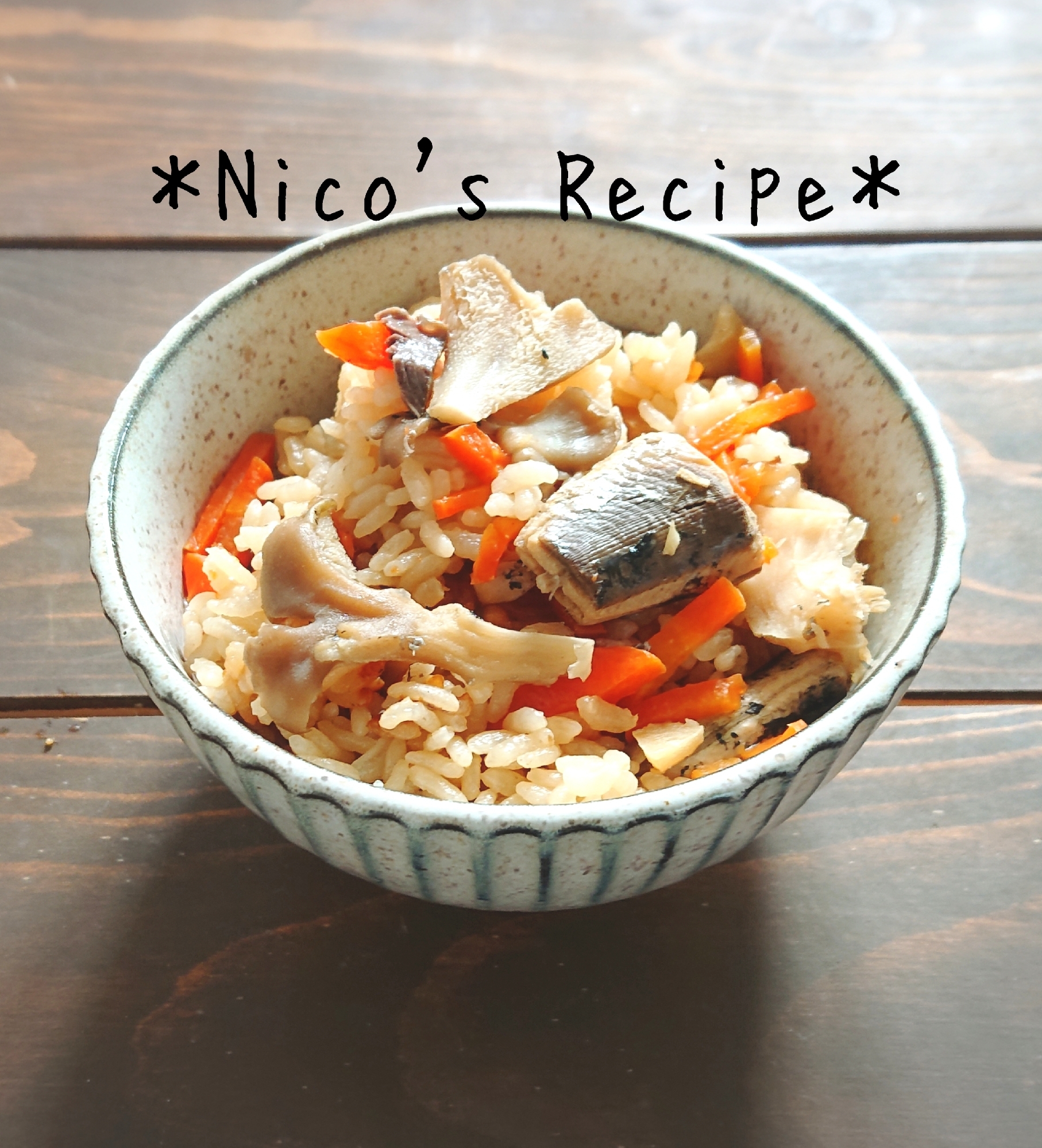 レシピタイトル:いわしの味噌煮缶と舞茸の炊き込みご飯