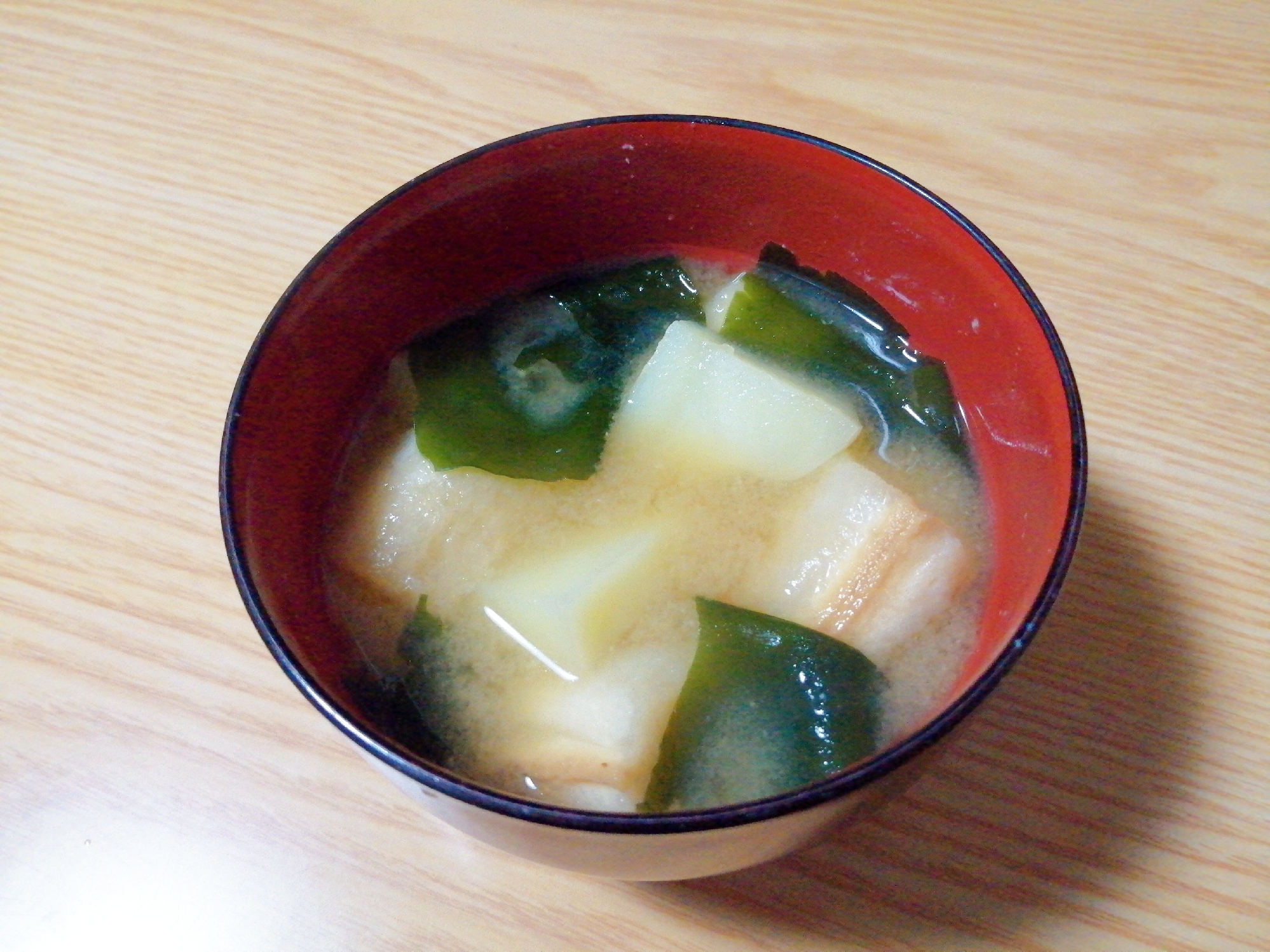 レシピタイトル:じゃがいもと麩とわかめの味噌汁