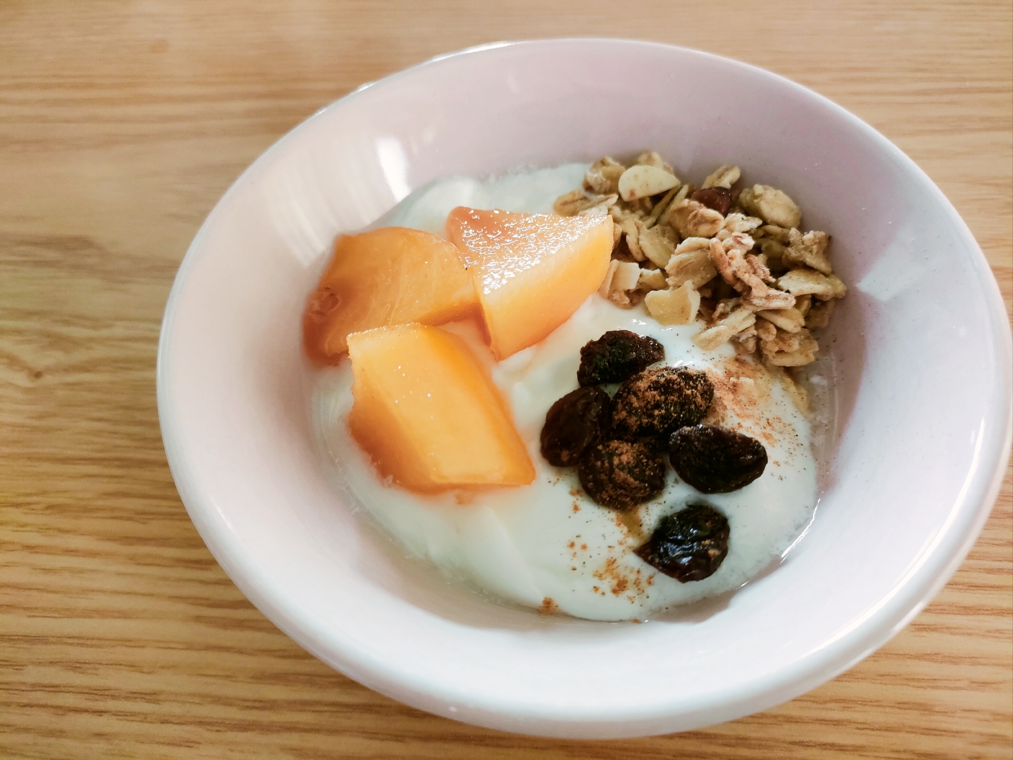 レシピタイトル:柿とグラノーラとレーズンのヨーグルト