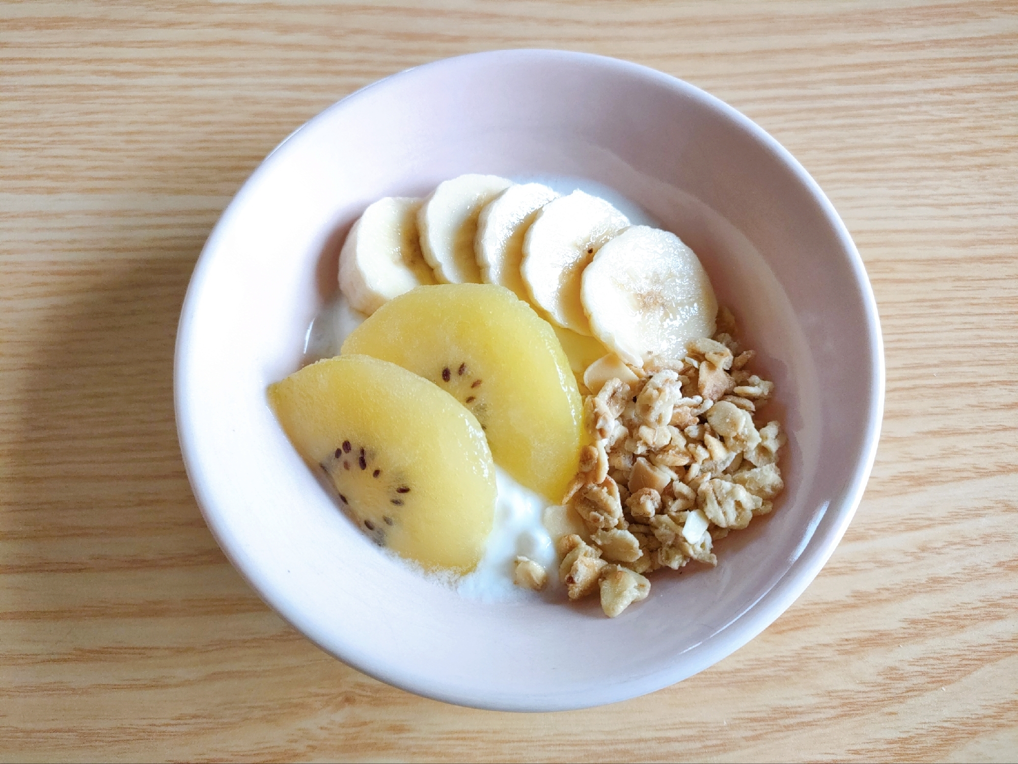 レシピタイトル:バナナとキウイとグラノーラのヨーグルト
