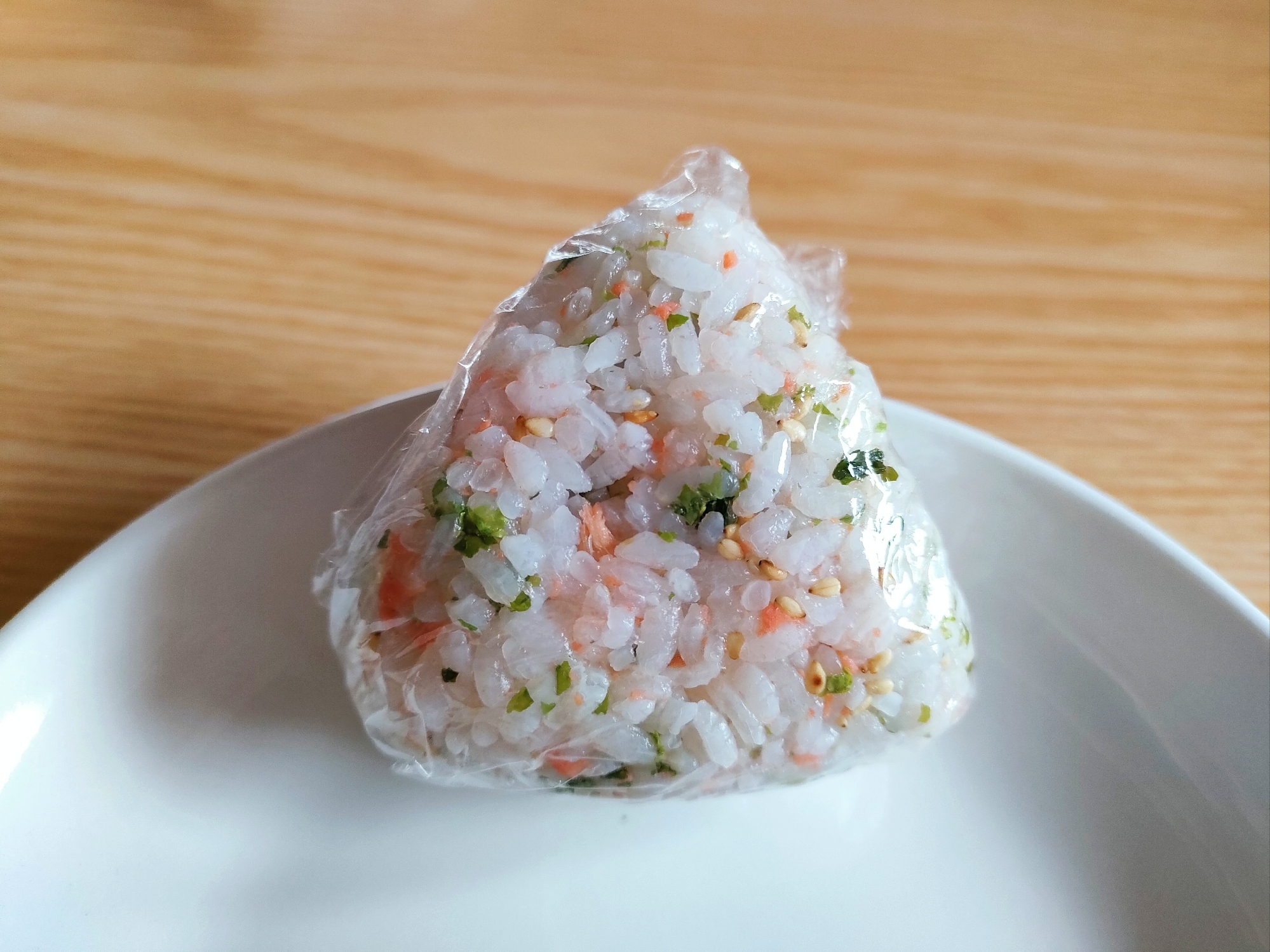 レシピタイトル:鮭フレークとあおさとごまのおにぎり