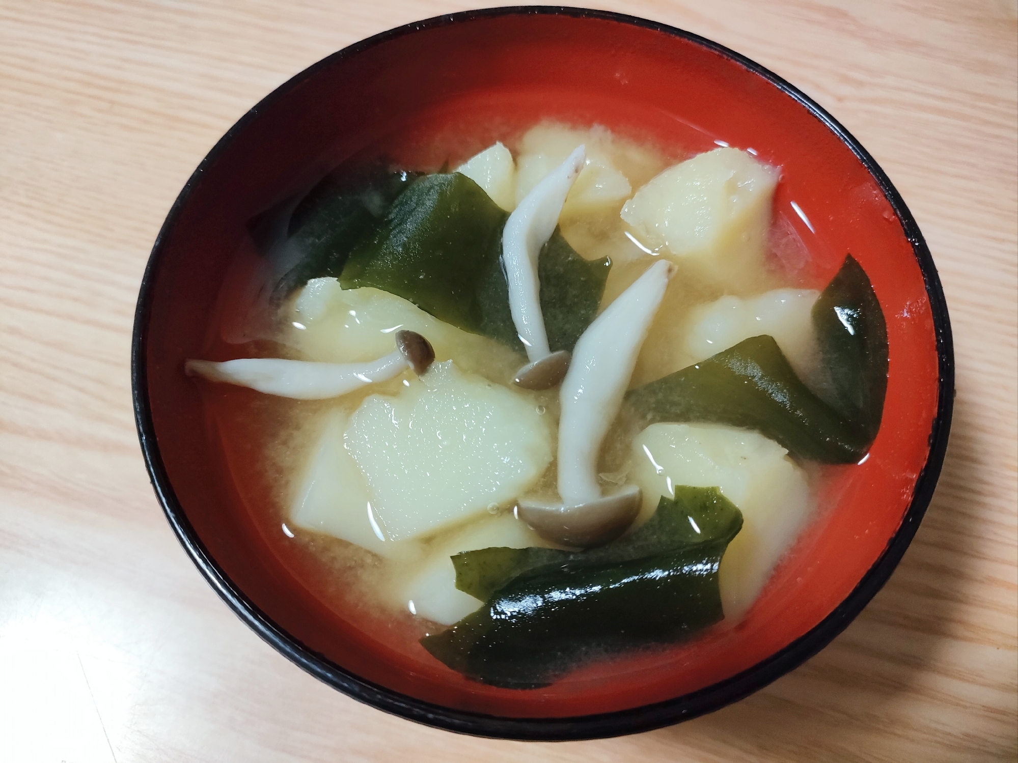 レシピタイトル:じゃがいもとしめじとわかめの味噌汁